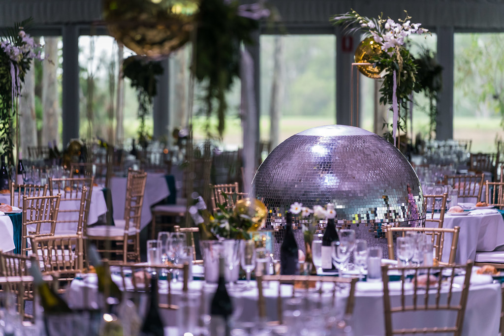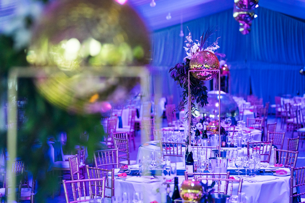 Gold disco balls – Scattered across tables and suspended above the dance floor, these instantly set the tone for a retro-glam celebration.
