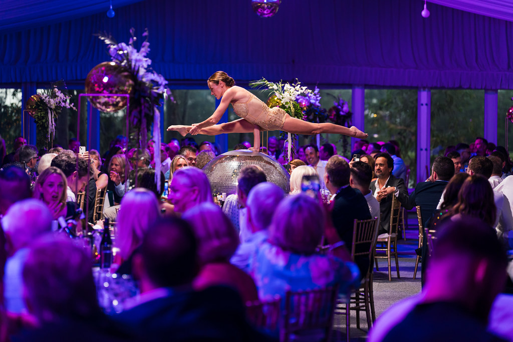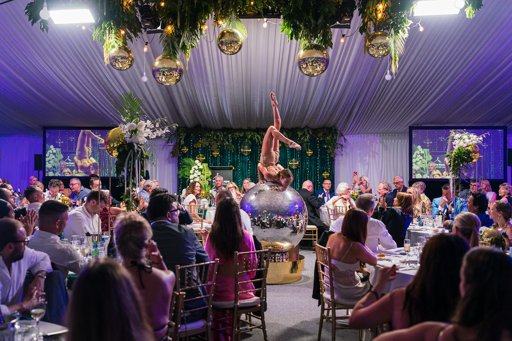 From glittering mirror balls to colour-drenched lighting, every styling decision was made to support the disco theme. We created zones throughout the venue, each styled with intent, so the space felt cohesive yet dynamic. One of the most powerful features was our hanging disco ball installation, which created a canopy of sparkle overhead. Not to mention, the luxe table styling featured layered textures, glowing votives, and mirrored accents. All of these choices reflected our tailored approach to disco-themed corporate event styling, where mood, materials, and motion all work together.