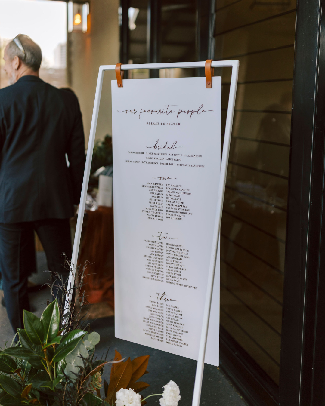 Custom signage ensured cohesion and flow throughout the celebration. Firstly, a terracotta-toned welcome sign greeted guests with warmth and character. Then, a clean seating chart guided guests seamlessly into the reception. Similarly, menus tied back to the earthy tones, carrying the palette across every layer of the design. Because of this, the graphic details were both practical and stylish, reinforcing the couple’s aesthetic.