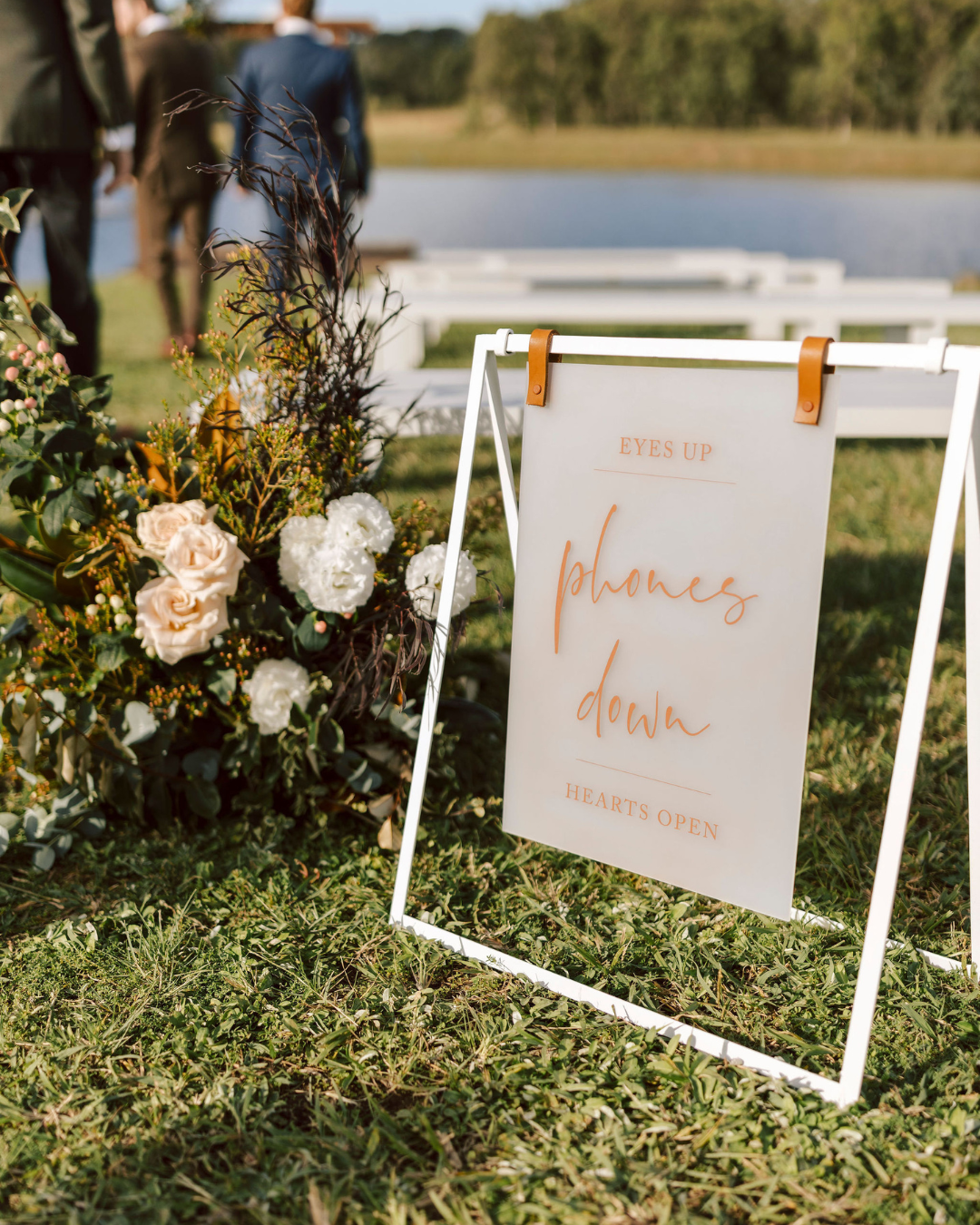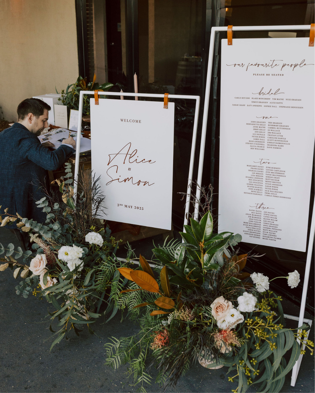 Finally, Alice & Simon’s autumn Bimbadgen Palmers Lane wedding demonstrated the value of working with our team. Because we bring styling, florals, signage, and hire into one seamless service, couples receive a cohesive look and a stress-free experience. Not only that, but our team also handles delivery, installation, and pack down so you can simply enjoy your day. With this in mind, if you’re dreaming of a wedding that feels layered, intimate, and true to you, we’d love to help bring it to life.