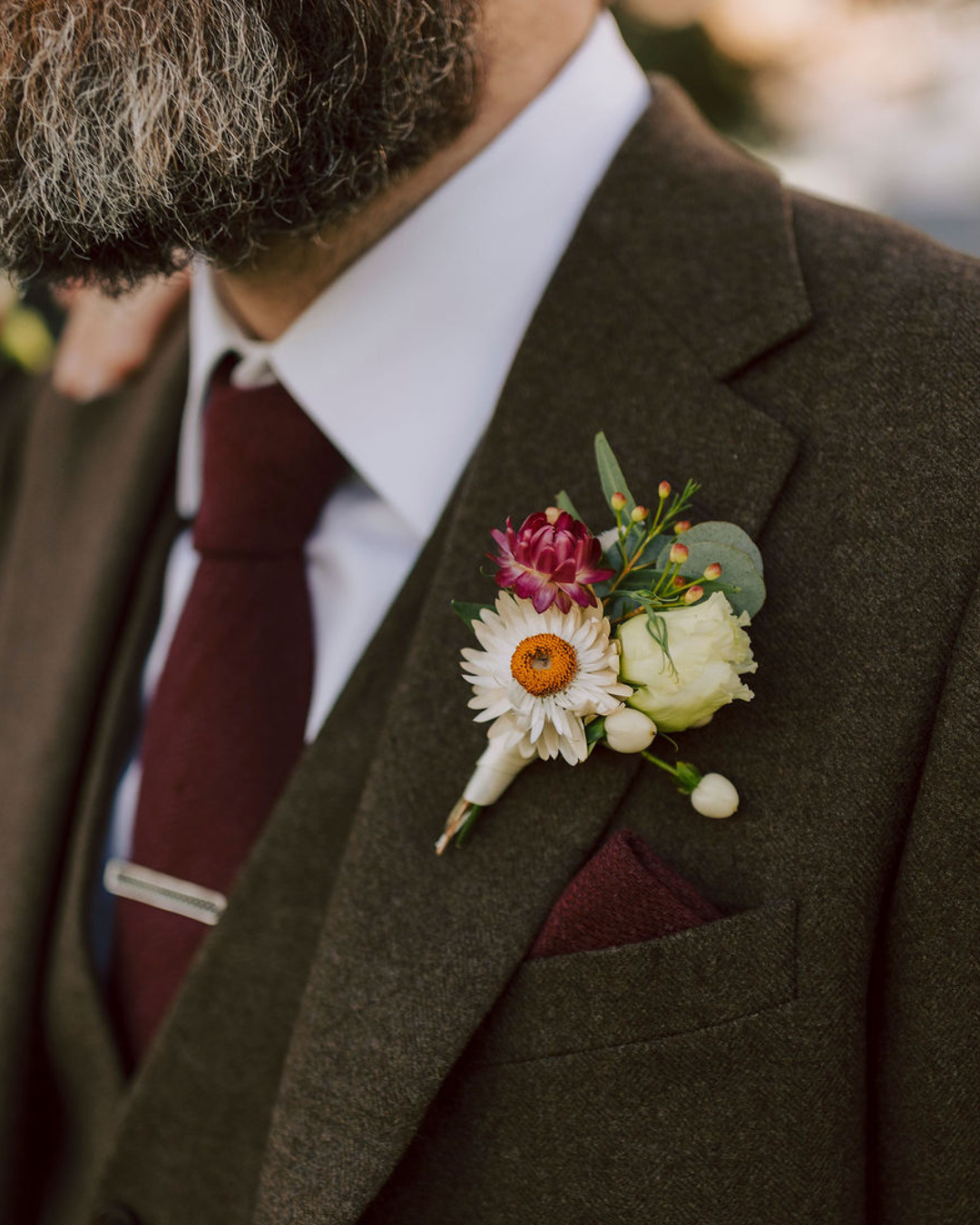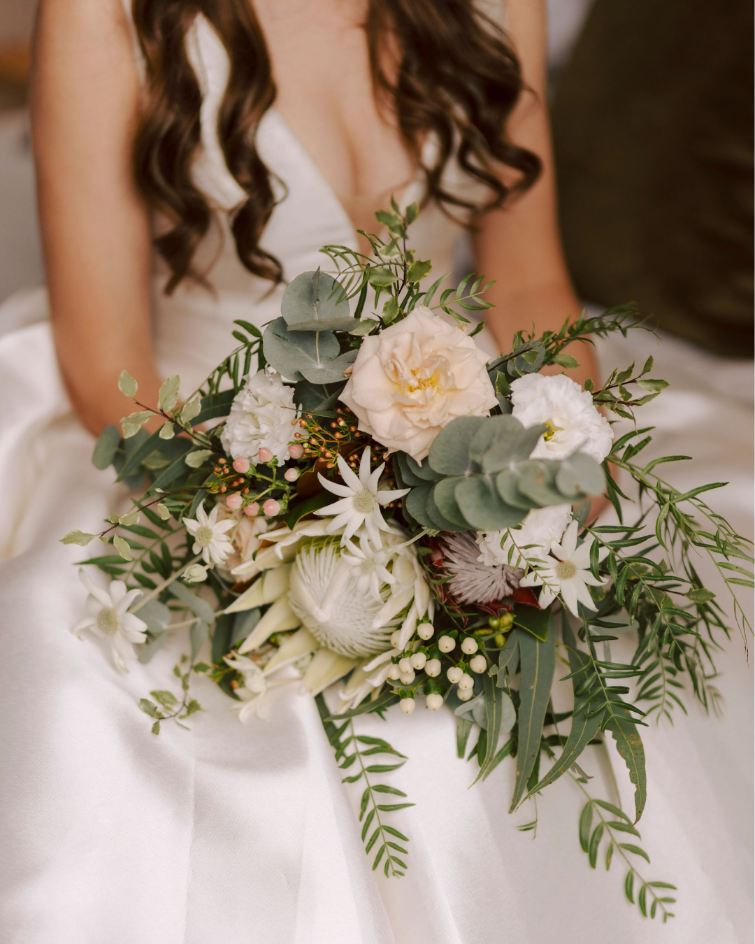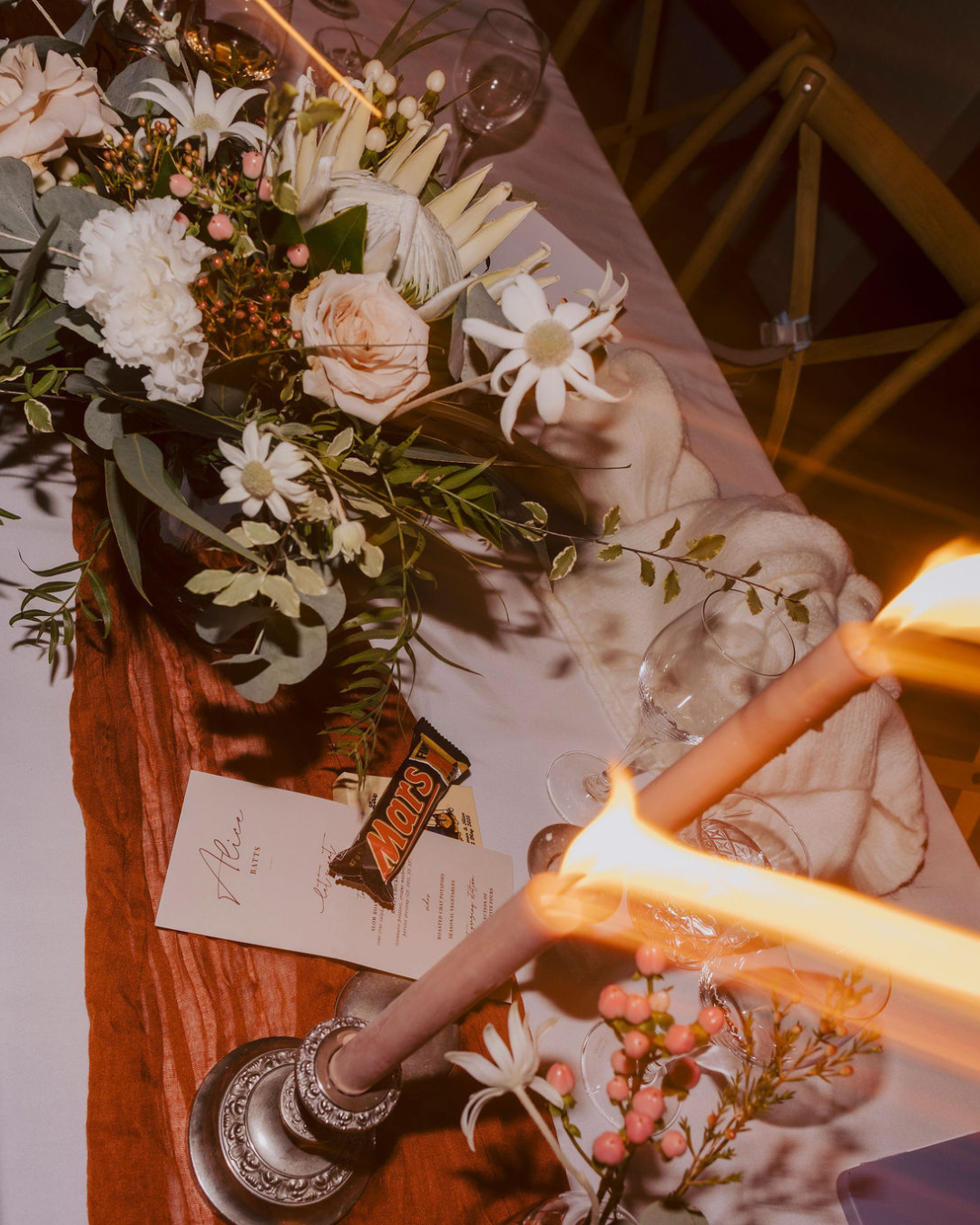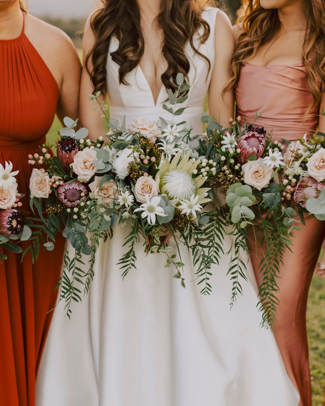 Then came the florals, which brought the palette to life. Firstly, bouquets featured soft roses, creamy blooms, and textured greenery that paired beautifully with the bridesmaids’ rust-toned gowns. Secondly, the arbour arrangement showcased natives, roses, and foliage in cascading abundance. Not to mention, the reception florals were kept low and textural, pairing perfectly with candlelight and allowing conversation to flow. As a result, the florals unified the entire event while adding natural movement and depth.