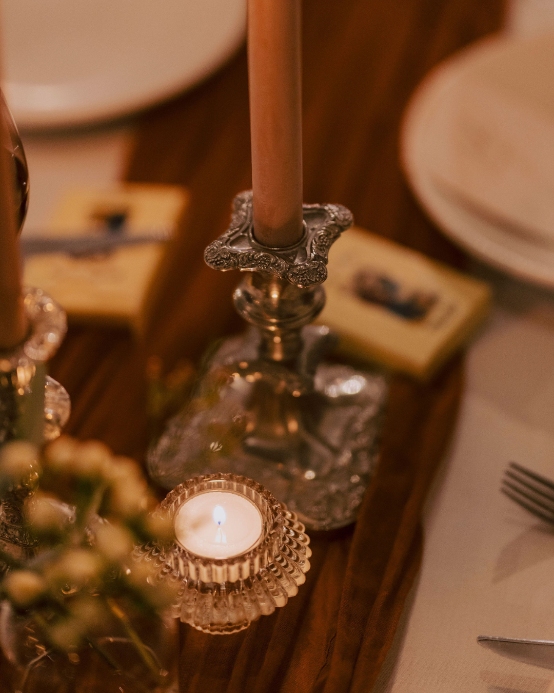 Dinner candles – Tall, glowing tapers in warm tones created romance and vertical interest across the tables.