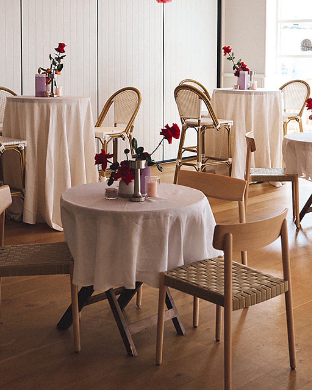 Round linen tablecloths: Soft white linen tablecloths anchored the tablescapes, offering a clean, coastal foundation that allowed the florals and décor to shine.