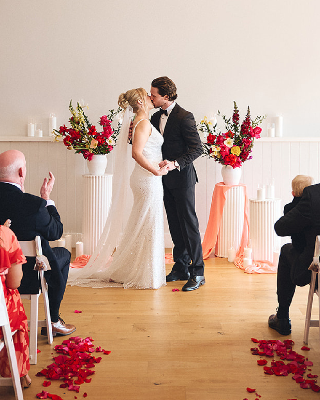 Alice and Nathan’s design brief was simple: create a colourful coastal wedding that felt fresh, modern, and filled with meaning. Because they loved a bold palette, we leaned into rich reds, fuchsia pinks, and bursts of citrus orange. In addition, soft blush tones and creamy neutrals balanced the colour story. On the other hand, natural materials like timber and linen grounded the look in coastal ease. Overall, the result was vibrant, cohesive, and deeply personal. A visual story of joy by the sea.