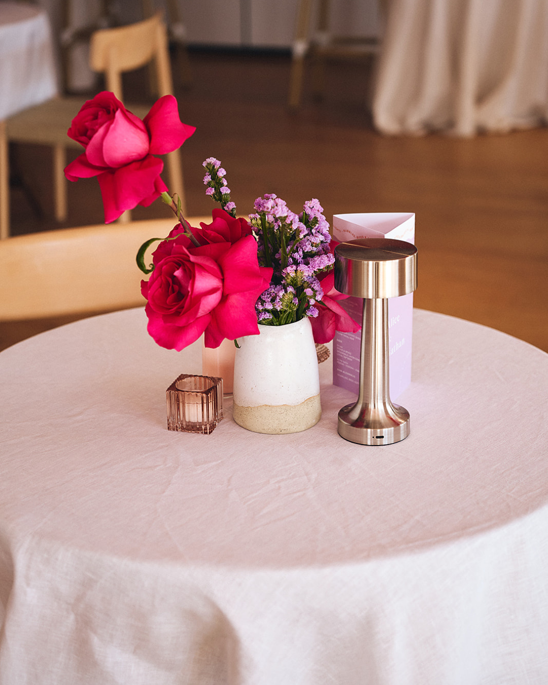Alice and Nathan shared their love for bold, joyful blooms, so florals became a true statement piece. We combined crimson roses, hot pink ranunculus, and soft lilac stems to create movement and contrast. Because each arrangement was intentionally placed, the floral styling framed every important moment, from the alter to the cake table. In contrast, minimal greenery allowed the colour story to shine. As a result, these florals became the heart of the colourful coastal wedding and tied the entire design together beautifully.