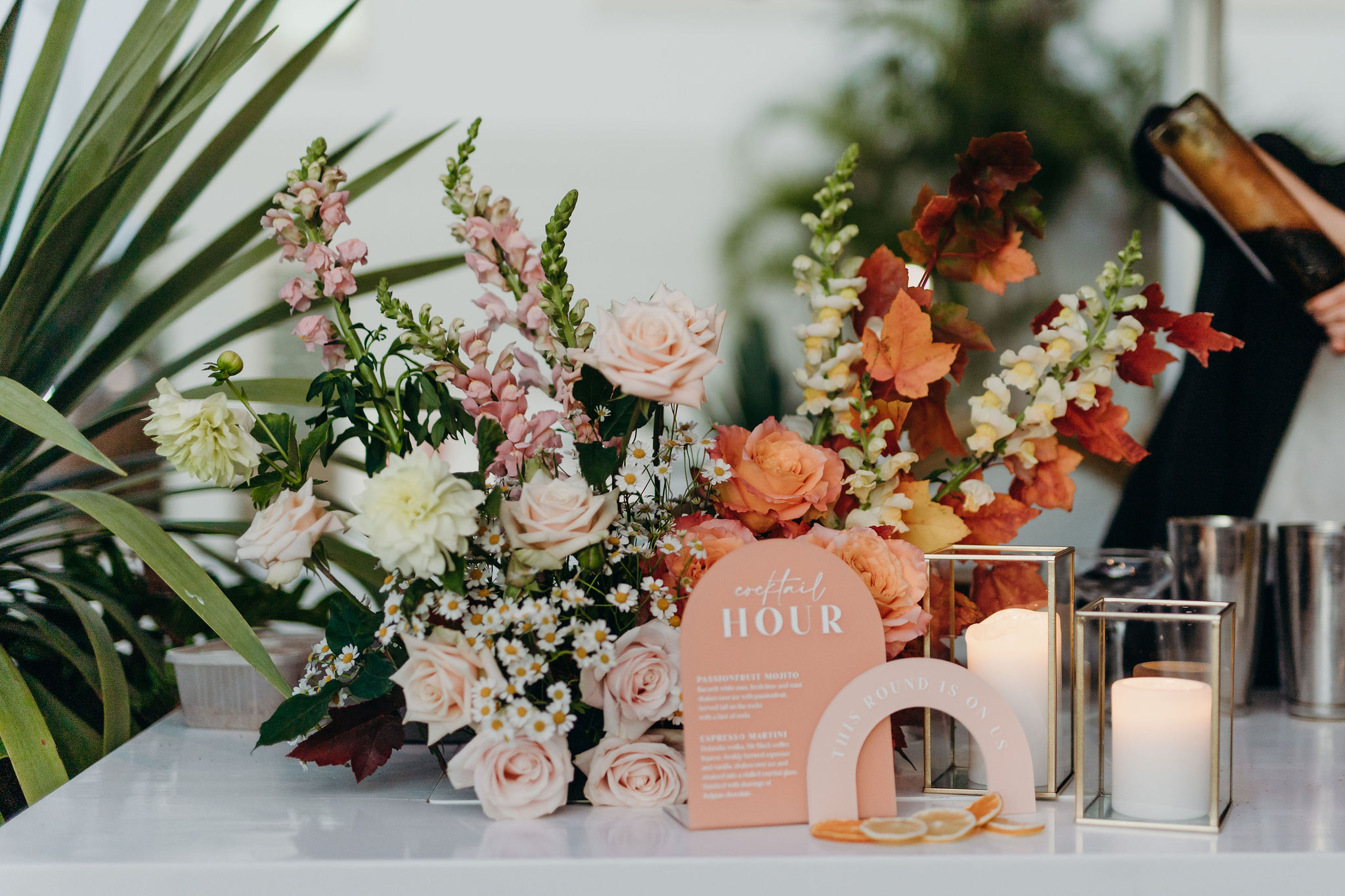 Pillar candles – layered across the tables and bar to bring softness and structure to low floral clusters