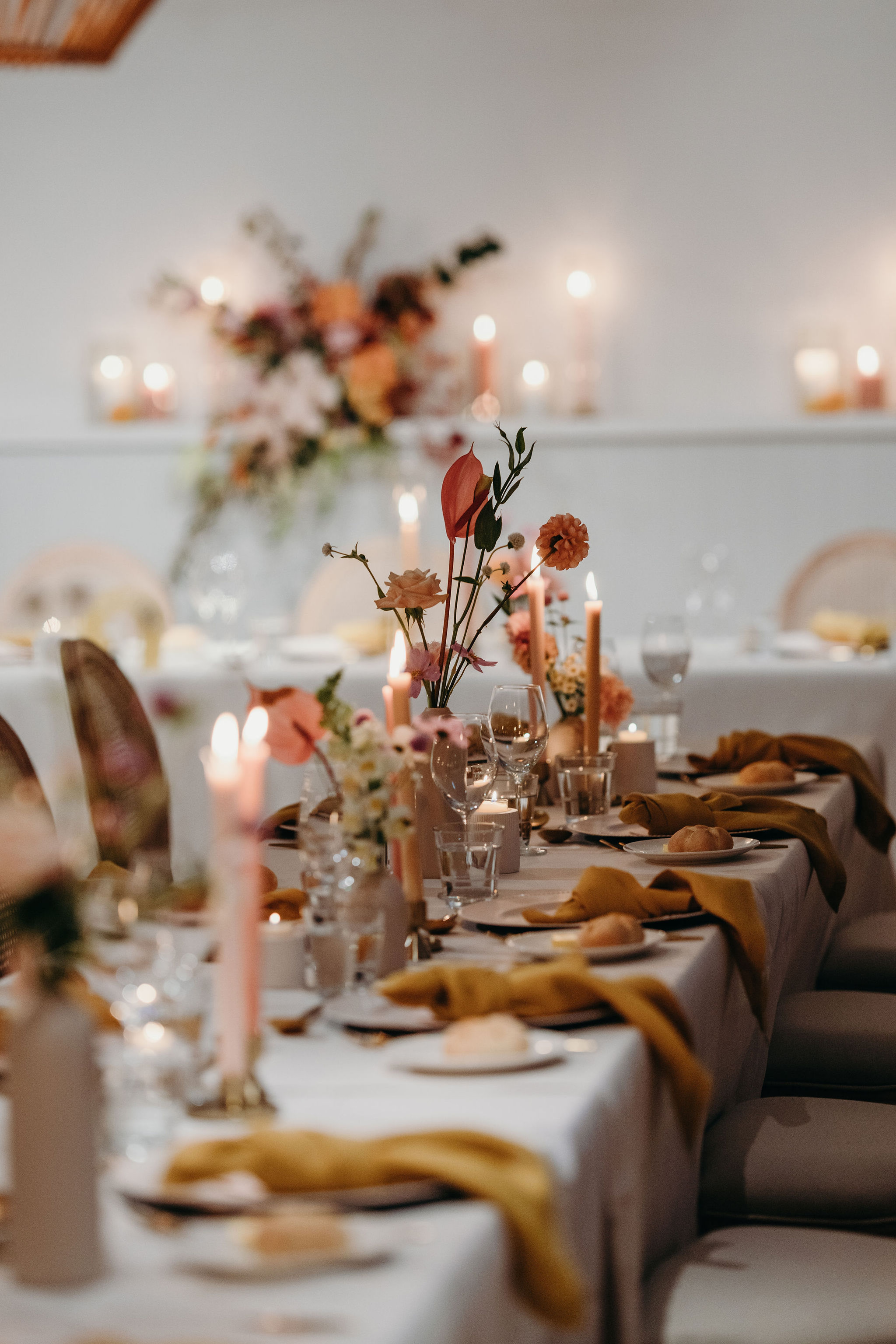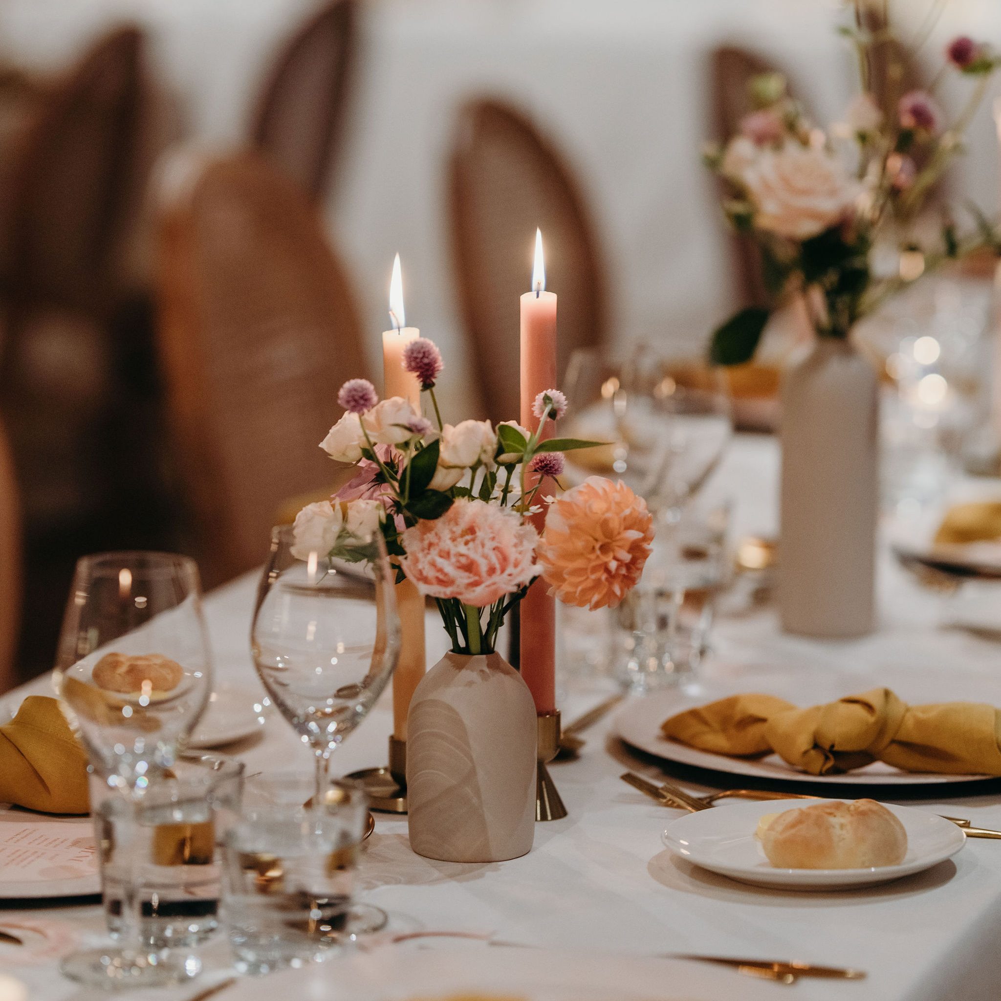 Dinner candles – long-stemmed and peach-toned, used to mirror the floral palette and draw the eye vertically