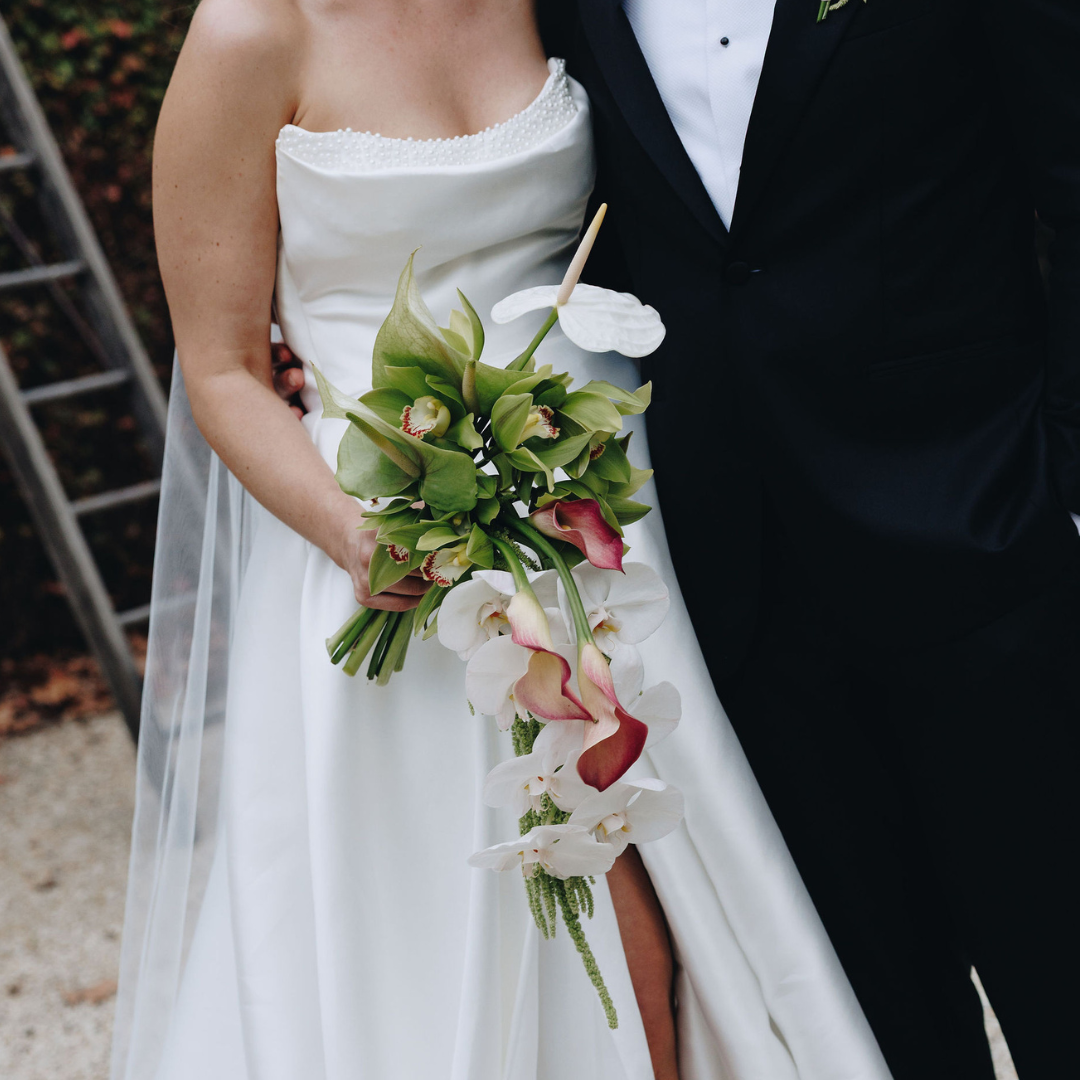 Alice and Corey’s brief was grounded in elegance, but not in the way that feels stiff or fussy. Our couple were drawn to a more minimal, natural style with refined details and a slightly moody edge. Think: sleek silhouettes, rich green foliage, creamy whites, warm lighting, and architectural florals.
