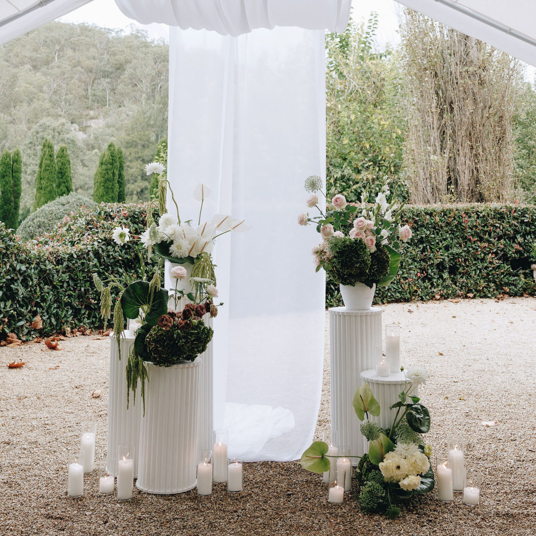 Scalloped Plinths: These soft white plinths added sculptural height and made the ceremony florals feel elevated and intentional.