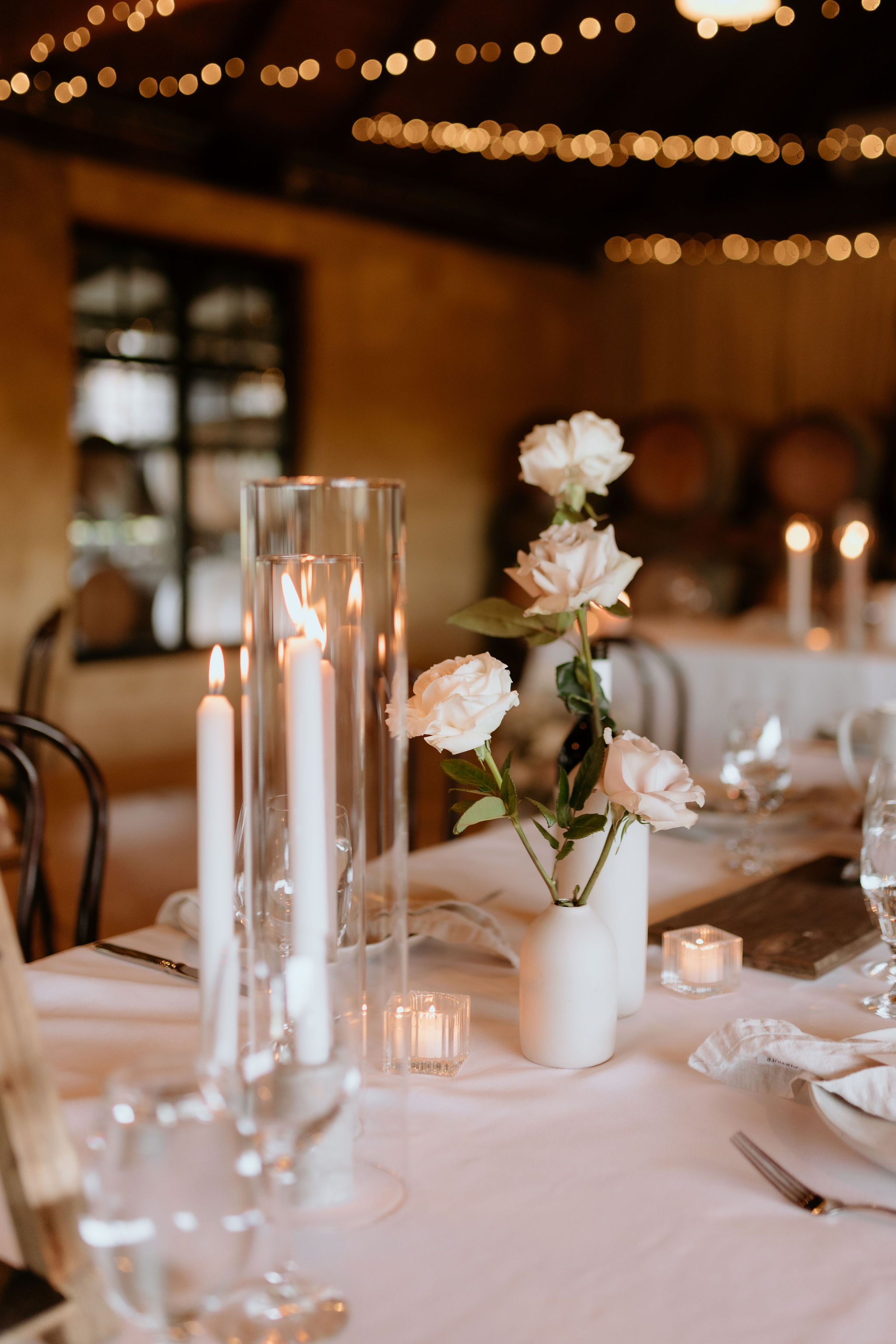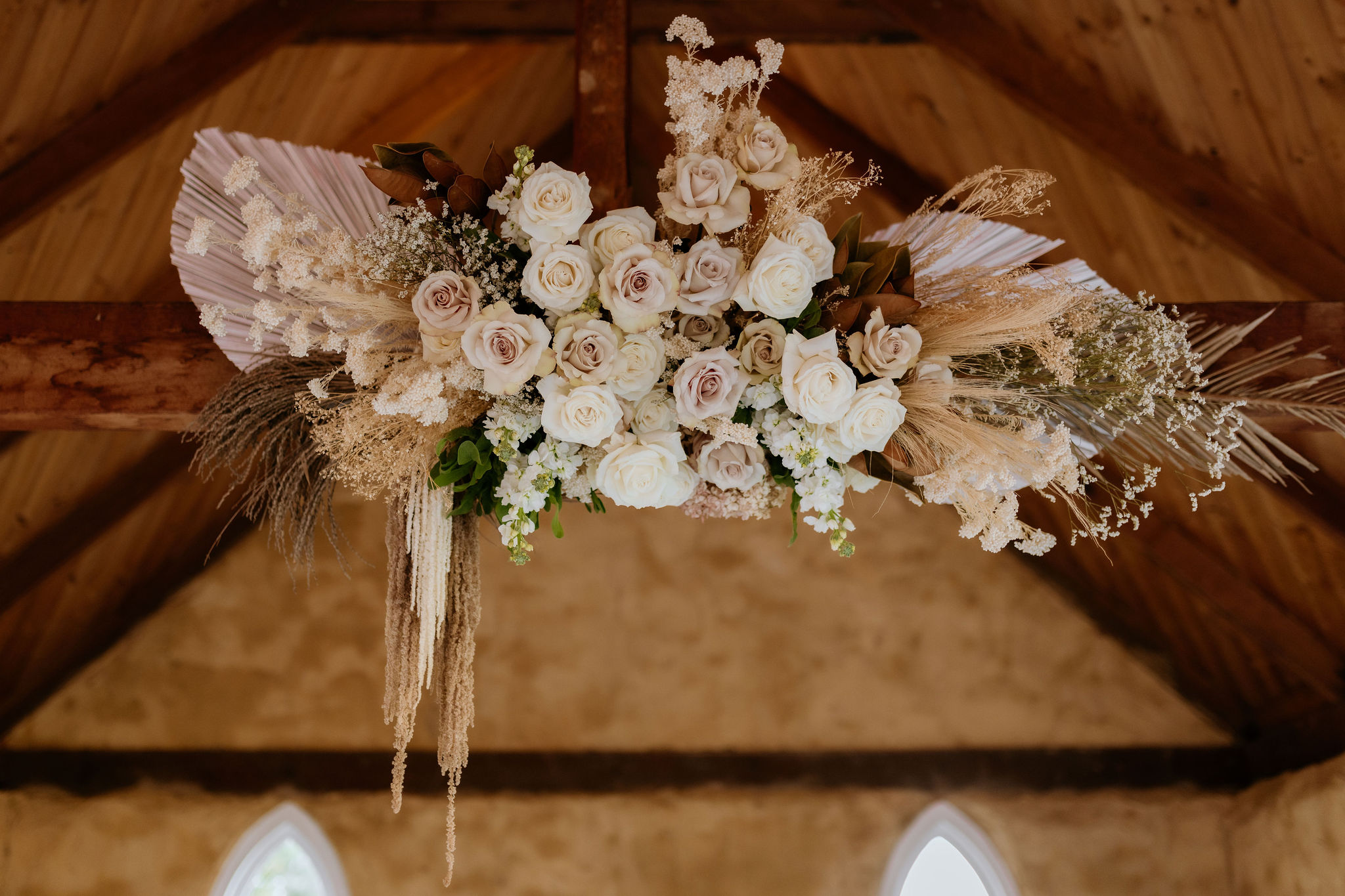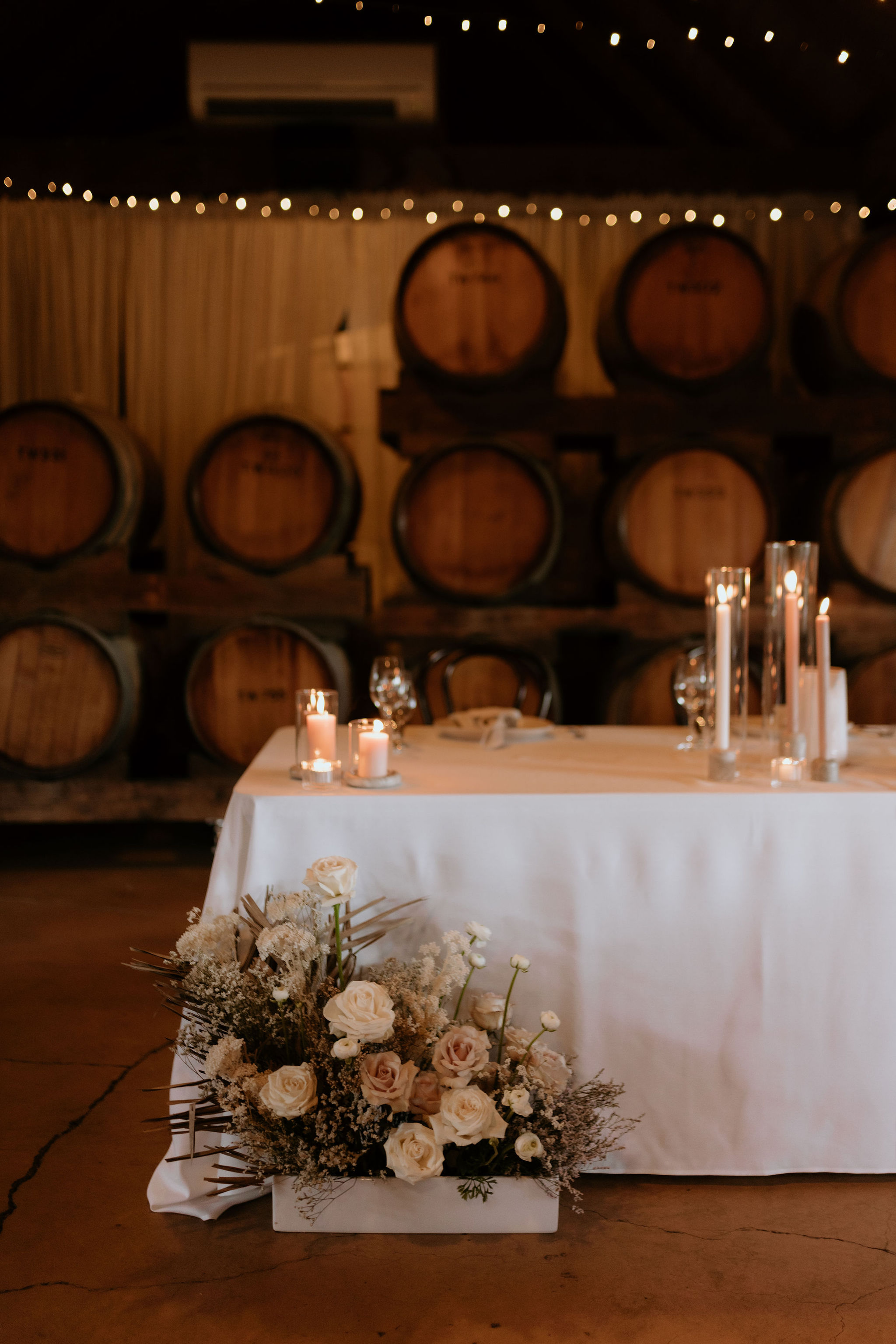 The floral styling was soft, textural, and romantic. Cream and blush roses were paired with cascading amaranthus and natural dried elements, creating arrangements that felt lush but not overwhelming. In the Barrel Room, low centrepieces and feature arrangements flowed seamlessly with the candle styling. At the chapel, a statement installation above the altar framed the couple beautifully, while Chloe’s bouquet tied everything together with soft pinks, whites, and fresh greenery.