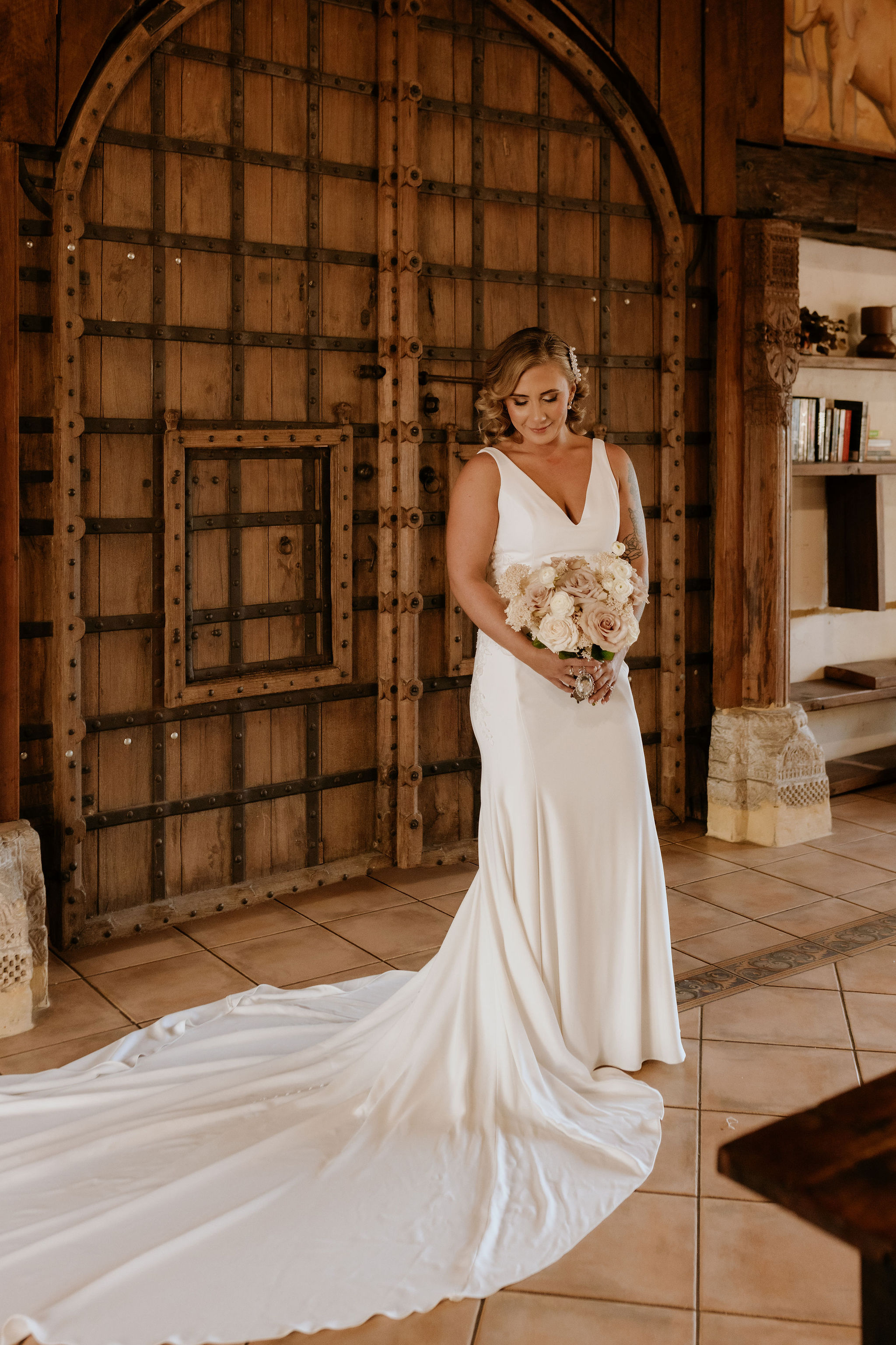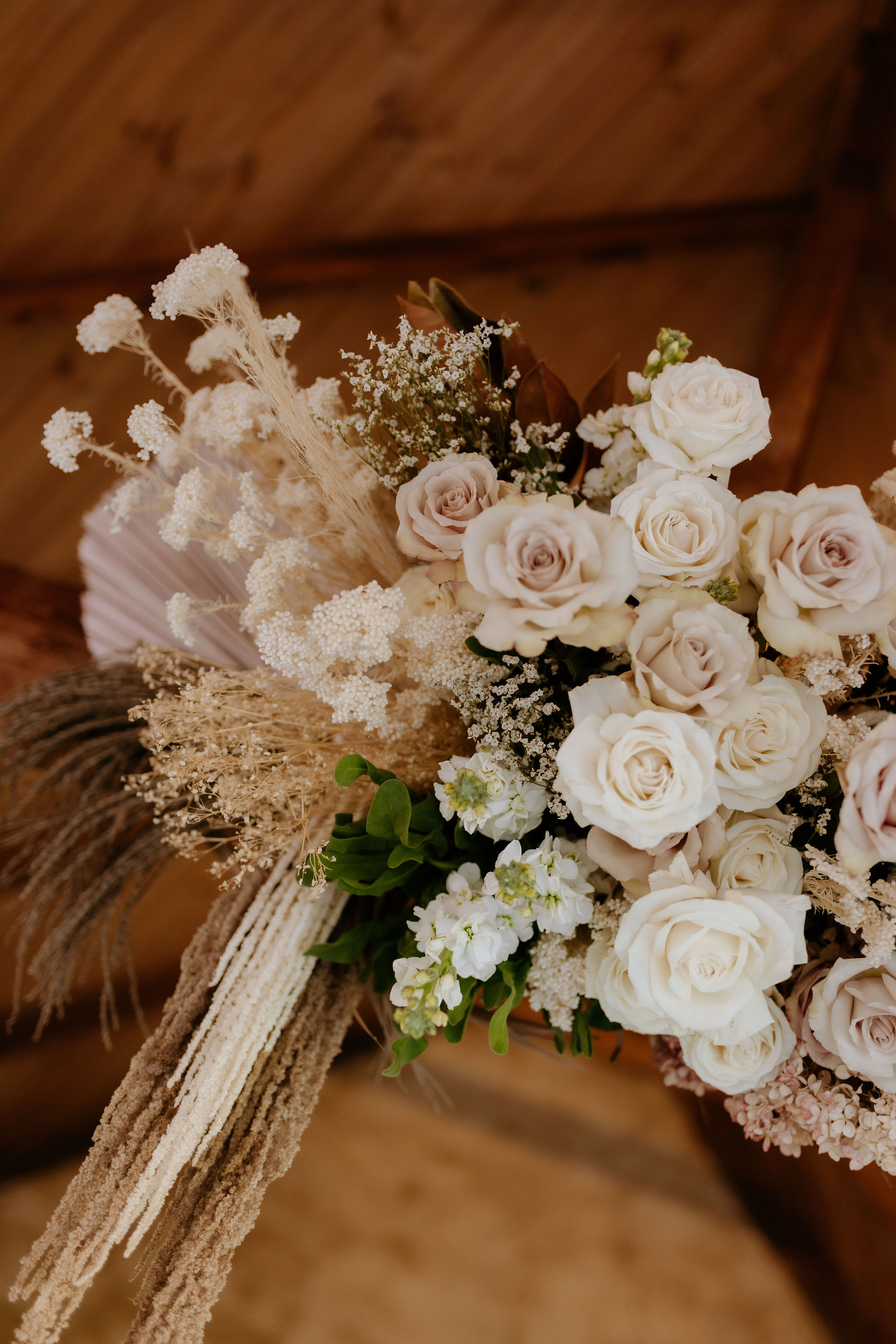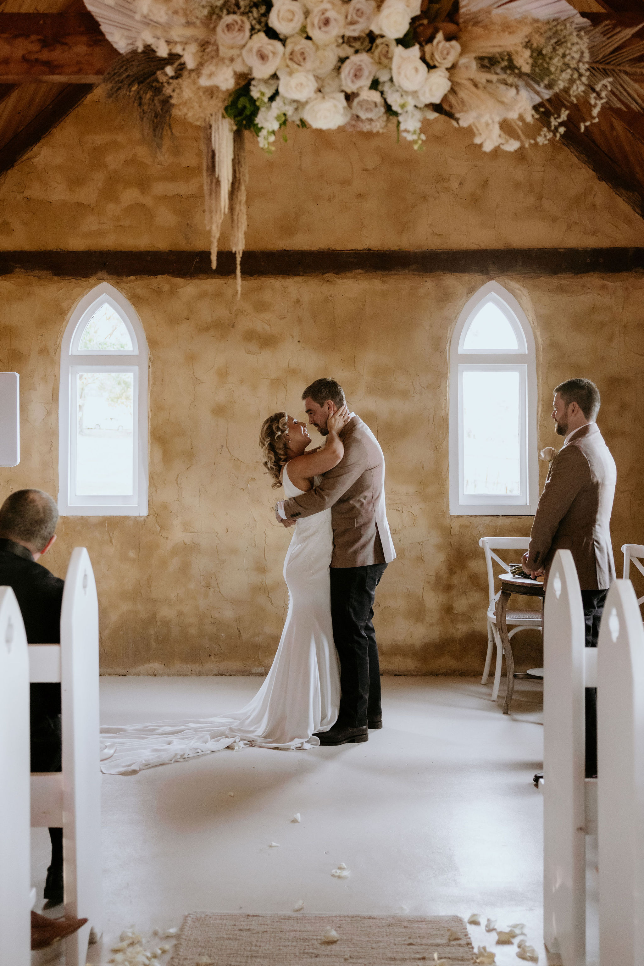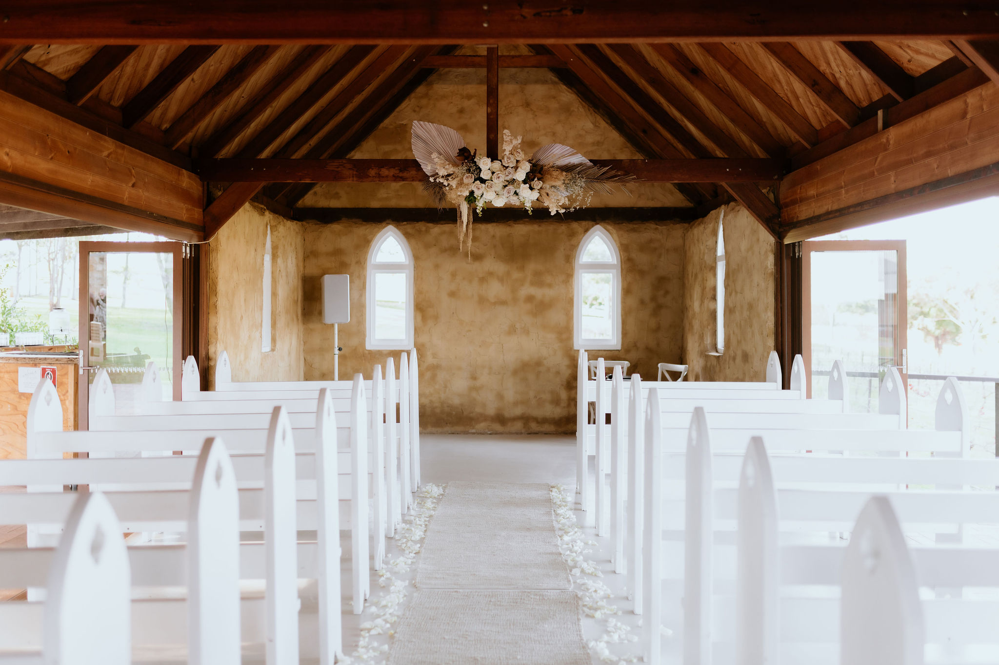 The floral styling was soft, textural, and romantic. Cream and blush roses were paired with cascading amaranthus and natural dried elements, creating arrangements that felt lush but not overwhelming. In the Barrel Room, low centrepieces and feature arrangements flowed seamlessly with the candle styling. At the chapel, a statement installation above the altar framed the couple beautifully, while Chloe’s bouquet tied everything together with soft pinks, whites, and fresh greenery.