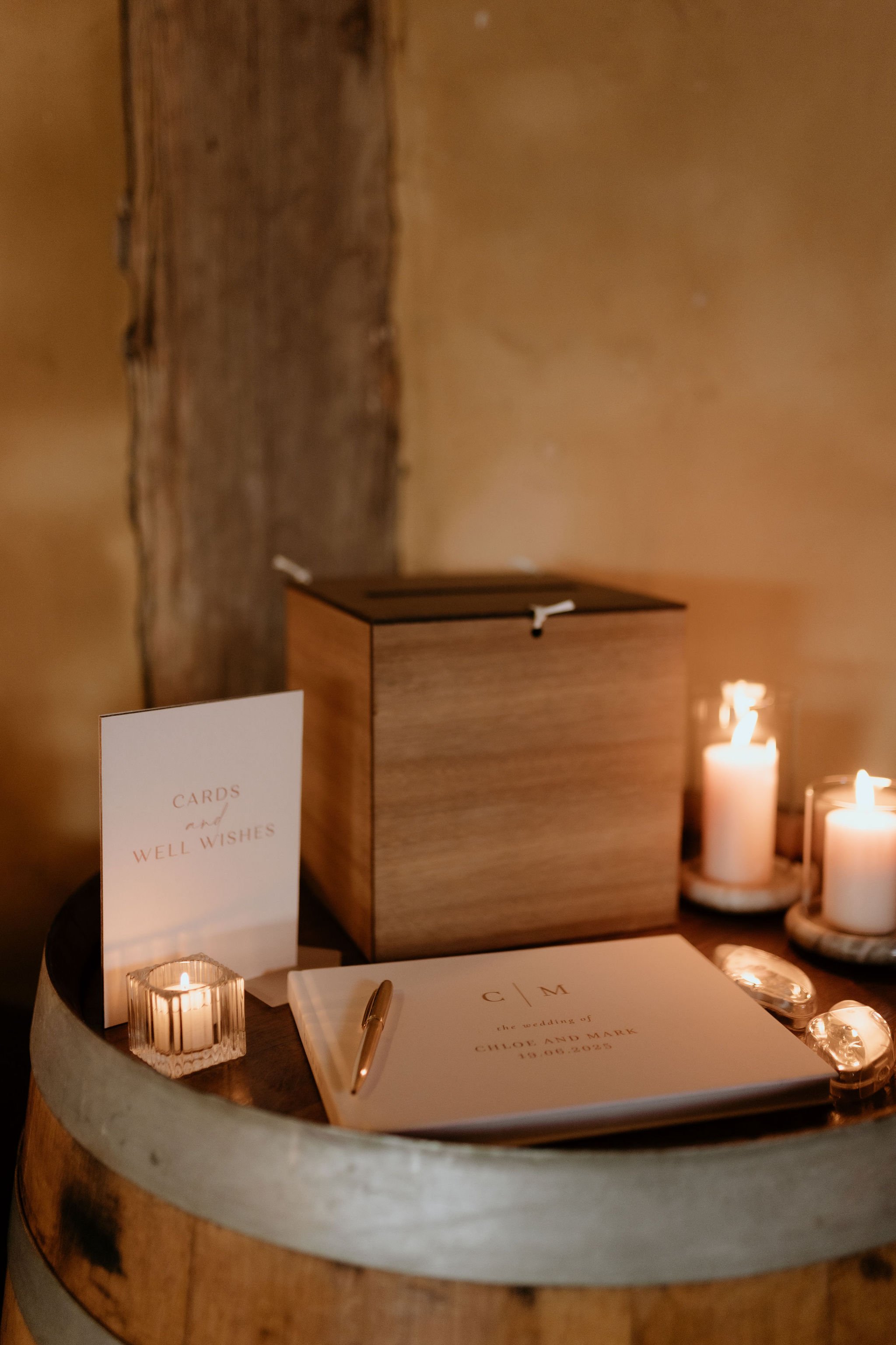 Timber wishing well – styled on a wine barrel with candles and signage, it became a beautiful focal point for guests to leave their well wishes.